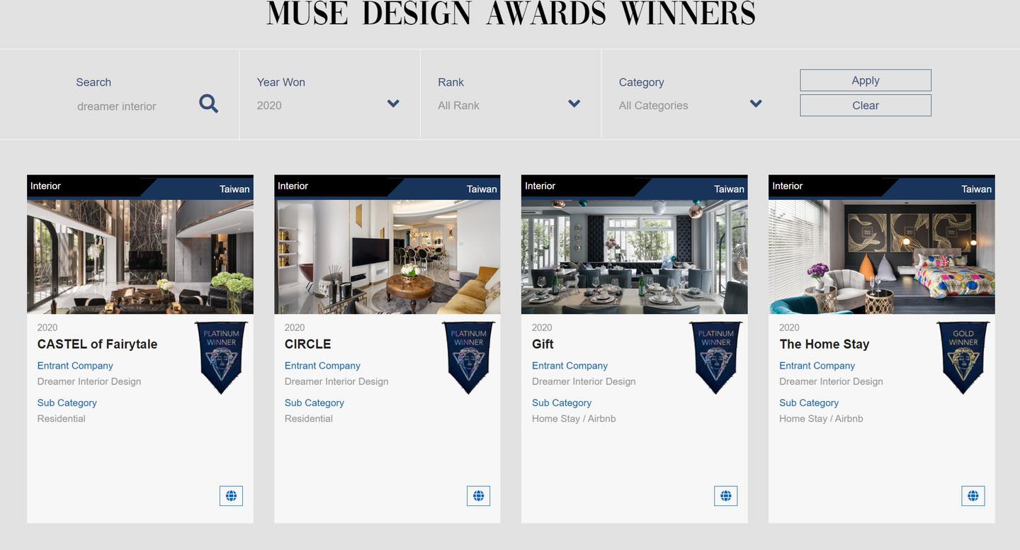 2020美國MUSE DESIGN AWARDS- Platinum鉑金大獎三座+一座Gold金獎