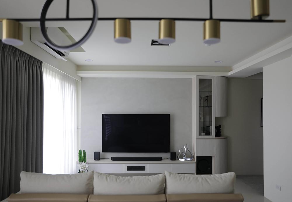 利用玄關與公領域交界點,打造弧形轉角櫃設計,中央規劃開放展示櫃,創造視覺延展;轉角櫃同時兼具動線指引,且與側邊收納機能、電視牆形成立面造型。開放公領域裡,戶外自然光隨著落地窗引入室內,光感輕灑石材磚鋪設的地坪,展現潔淨、明亮之意。電視牆以理性灰色襯底,下方搭配白色與淺木紋相融電器櫃,不落地櫃體安排,展現輕盈場域氛圍。